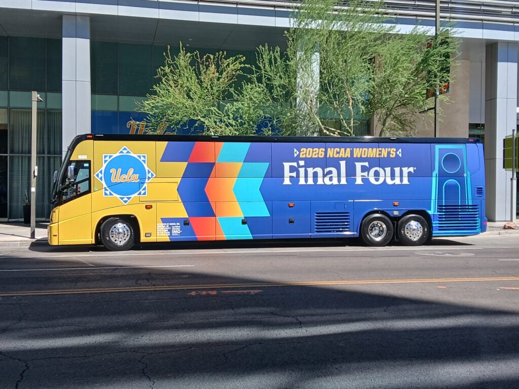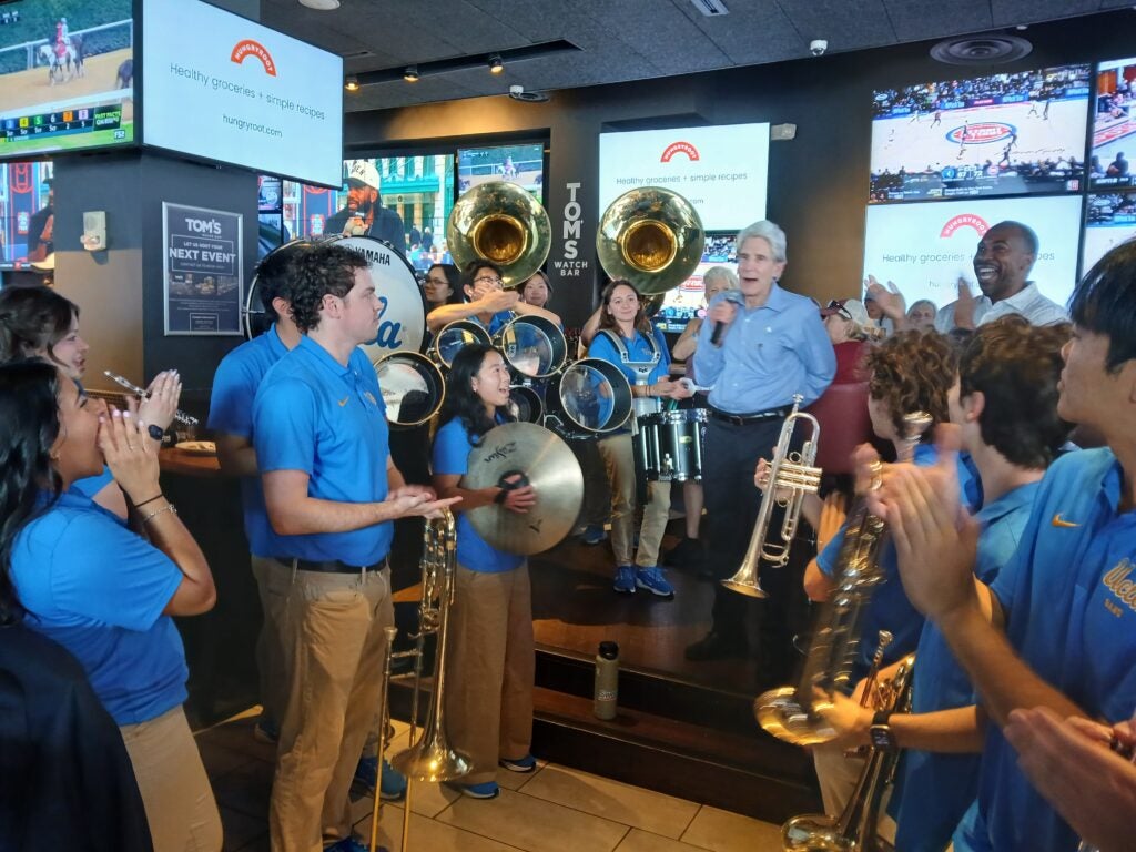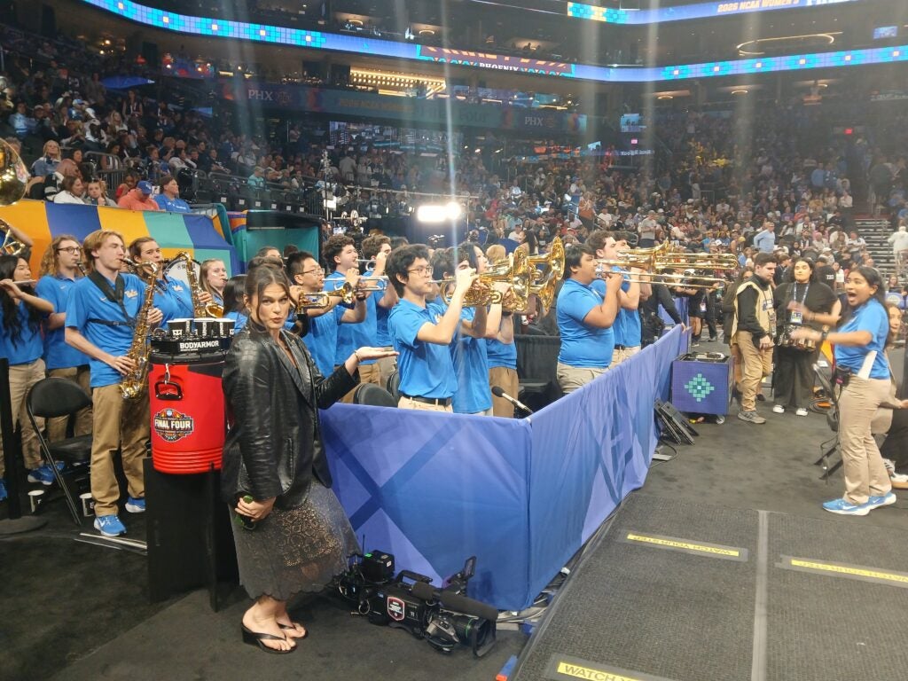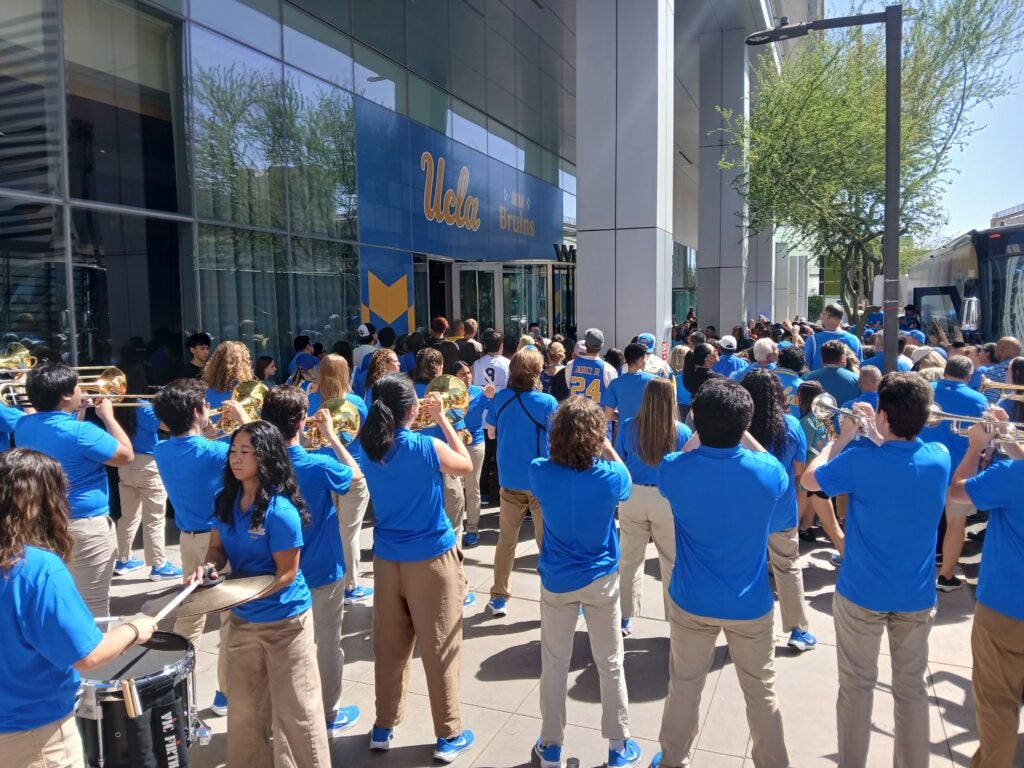 “The students balance heavy academic loads with their performances” said Justin McManus, director of athletic bands and music professor at The UCLA Herb Alpert School of Music. “They performed for the team on campus at Pauley Pavilion, at the Sweet 16 and Elite 8 in Sacramento, and at the national semifinal and championship games in Phoenix, AZ.”