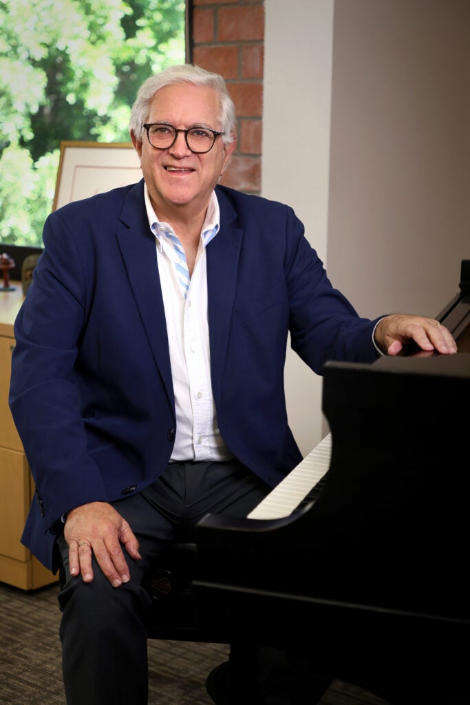 Beckerman began his term as dean on September 15, 2025, quickly settling into his office on the second floor of the Schoenberg Music Building. Along with his books, historical artifacts and art, he moved in a six-foot, four-inch Steinway Grand. He takes to the piano bench frequently throughout the week, whether to play Horace Silver’s Song for My Father, Adam Michna’s The Friendship of Angels (Czech 17th century), or Czech folk tunes, or just to help him think.
