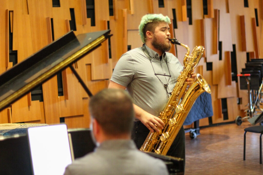 For Owen Richards, who entered as a music education student and is a member of the saxophone studio the social transition was easy. The saxophone studio is made up of students of all ages, from first years and transfers to graduate students. Quarterly recitals and group activities keep students close and collaborative. Still, the academic demands were significant. Due to the compressed timeline for graduation (two years), music education transfer students are required to take two sets of methods courses–meant to be taken in sequence–simultaneously.