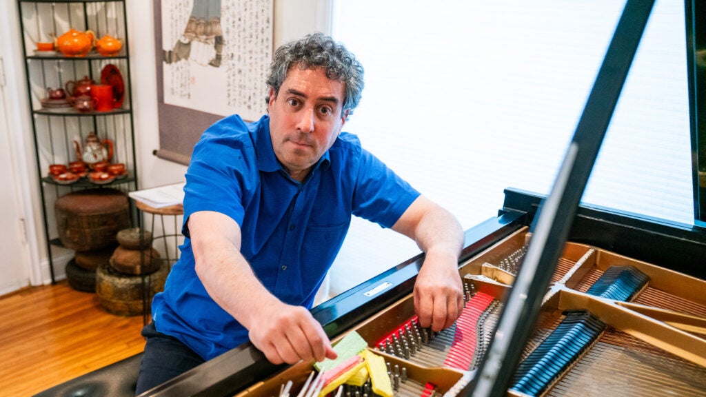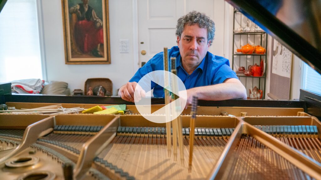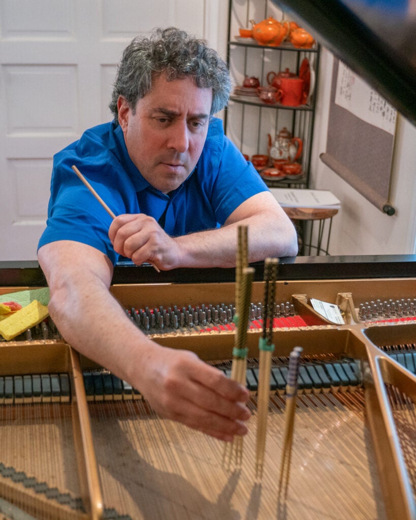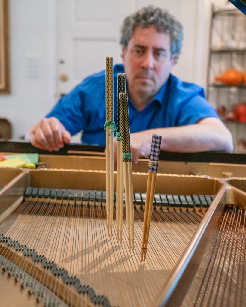 “To me, they sound like Chinese temple bells,” said Lefkowitz. He took hold of the lacquer chopsticks and dragged them through the strings toward the piano keys. The placement matters, he explained. He hit the piano key, then moved the chopsticks back up to their original position and hit the key again. “Do you hear it?”