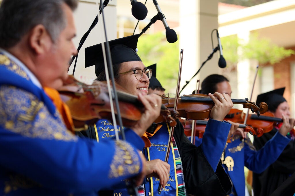 The commencement ceremony took place in Dickson Court North. The faculty and student processional was performed by The UCLA Herb Alpert School of Music’s Commencement Brass Ensemble and the West African Drum Ensemble. The celebration was marked by a special presentation of Dr. Diane White-Clayton’s gospel song “One by One,” performed by the African-American Music Ensemble with Dr. James Lent accompanying on piano. The Alma Mater was sung by all graduating vocal students, under the direction of Professor Michael Dean. The faculty and newly-minted graduates recessed to the music of Mariachi de Uclatlán.