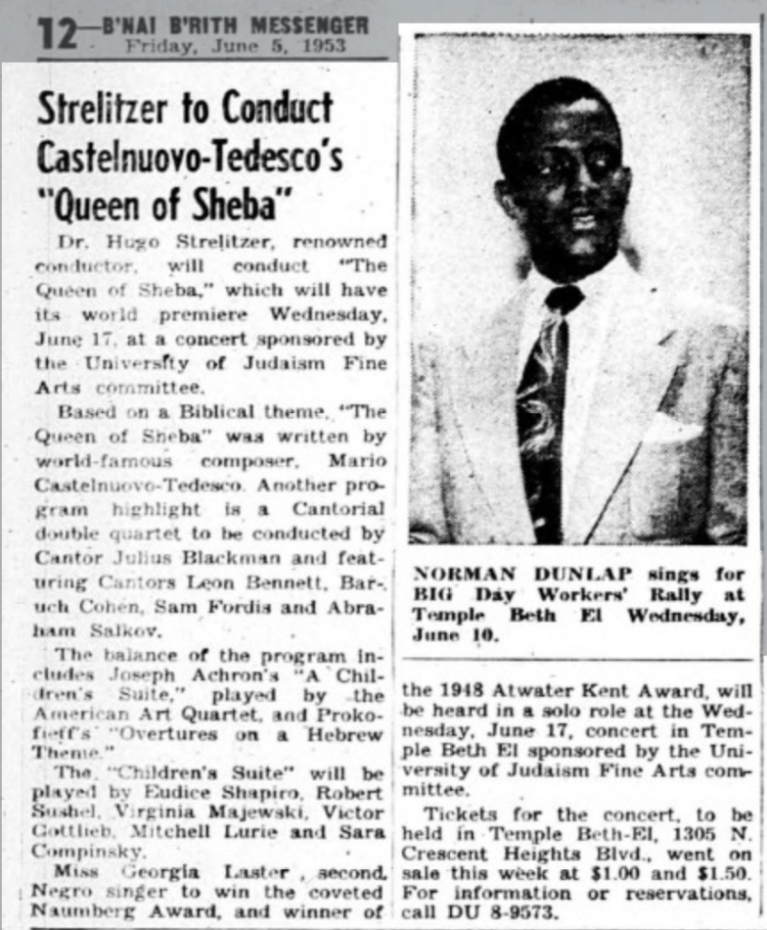 Alongside his work advocating for standardizing the remuneration of the labor of cantors, Blackman was also involved in initiatives that he saw as raising the prestige and aesthetic cache of the Los Angeles cantorial community. One major initiative he spearheaded was forming the Jewish Music Council, initially founded as an advisory board to the University of Judaism to raise musical education standards. At Blackman’s instigation, the Jewish Music Council expanded its footprint, inducting members from the broader pool of talent in Hollywood to create a musical community in which cantors were central members. Already in 1948, just a year or two after arriving in California, Blackman was organizing composition contests to attract composers to create new music for the synagogue. Blackman was seeking to draw the attention of Jewish musicians working in Hollywood to efforts focused on the community. [1] One of the key undertakings of the Jewish Music Council was producing concerts. The Jewish Music Council concerts that Blackman and his colleagues, including Cantor Nathan Katzman, produced took as their goal creating a sense of connection between the organized Jewish community and Jewish artists working in Hollywood. These concerts also had the purpose of trying to burnish the dignity and professional reputation of the cantorial trade through the association of cantors with prestigious artists. The issue of labor rights for cantors seems to have been linked to other social justice issues, namely the civil rights movement. In one of their landmark concerts held at Temple Beth El on June 17, 1953, to an audience of 1200, the Jewish Music Council invited the composer Mario Castelnuovo-Tedesco to create a new piece, a cantata titled “The Queen of Sheba.” [2] The premiere was performed by the African American soprano Georgia Ann Laster, winner of the prestigious Naumberg Foundation Award in 1952. [3]