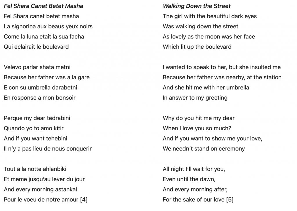 The following version was recorded by New Yorker Gloria Levy, the daughter of Sephardic immigrants from Alexandria, Egypt and Izmir, Turkey. “Fel Shara” (1958) is a Sephardic version of the original melody with exceptionally mixed lyrics that emphasize the cosmopolitanism of the Sephardic Egyptian population. Its lyrics are an amalgamation of Arabic, Ladino, Judeo-Italian, Judeo-French, Berber, and English: