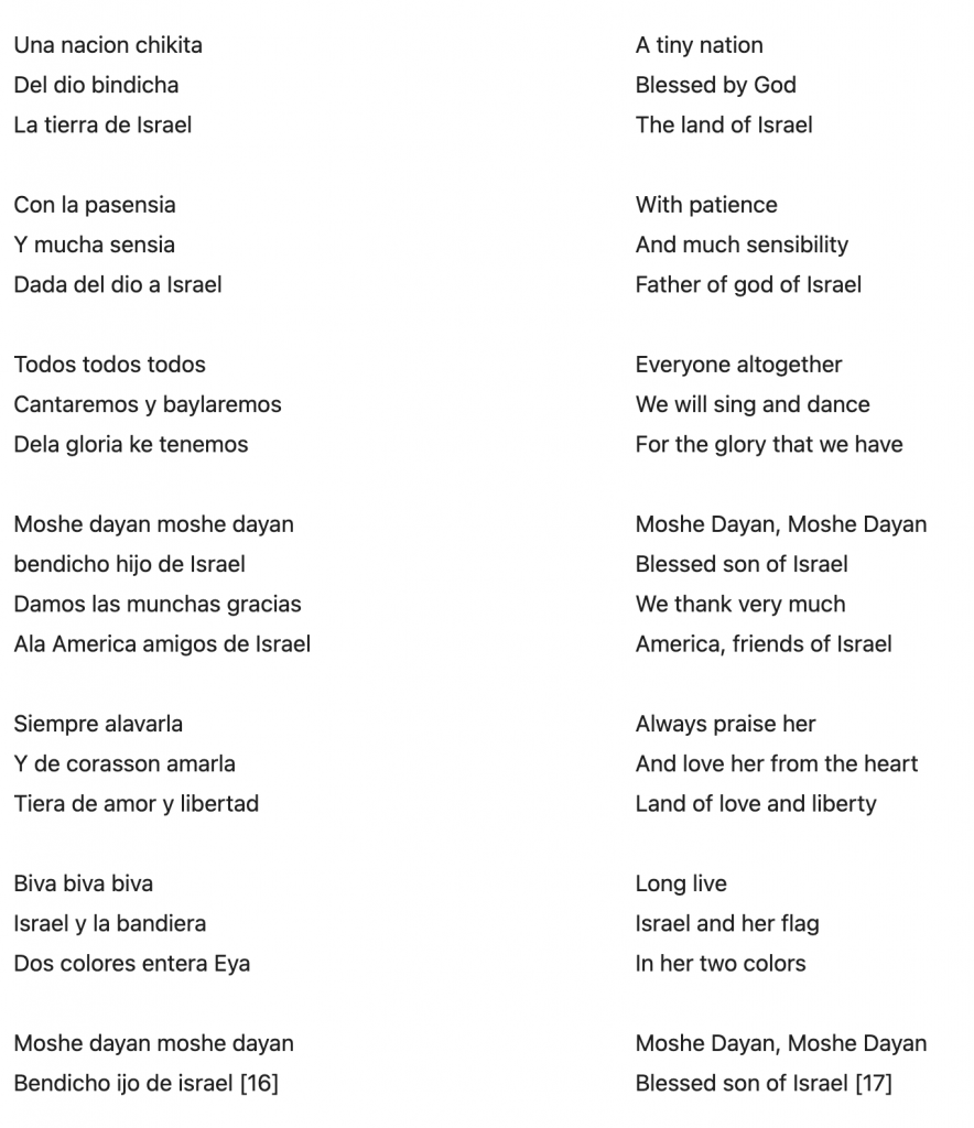 - This was also a phenomenon in Hebrew adaptations of Judeo-Spanish melodies. For more, see: Seroussi, Edwin and Susana Weich-Shahak. 1990-91. “Judeo-Spanish Contrafacts and Musical Adaptations, The Oral Tradition” Orbis Musicae 10. 164-194.