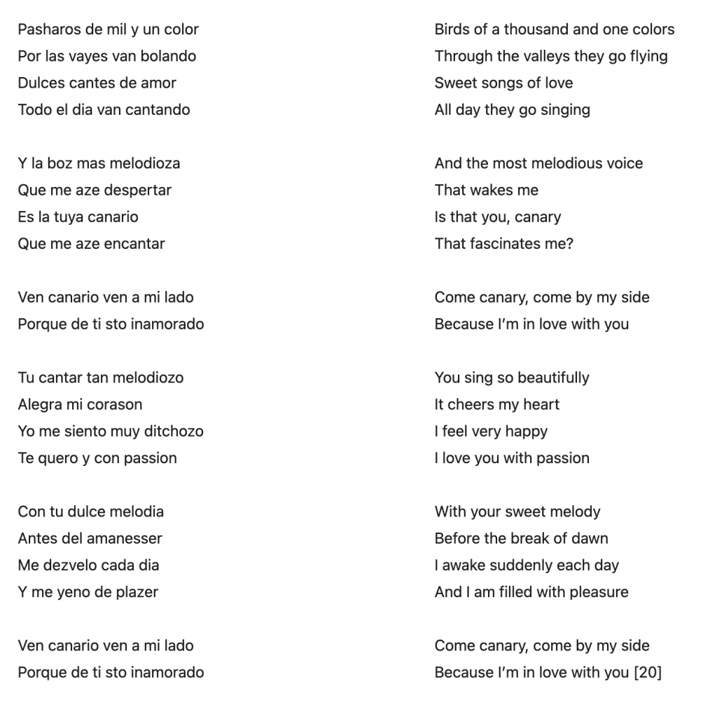 In the Turkish version, the lover is called a “bülbül” or nightingale. The nightingale has literary significance in that it represents love and death simultaneously. [21] It is said that the nightingale only sings when separated from its mate. The bird in question, however, changes to a canary in the melody’s Greek version. Mayesh’s Ladino lyrics most resemble the lyrics in Greek.
