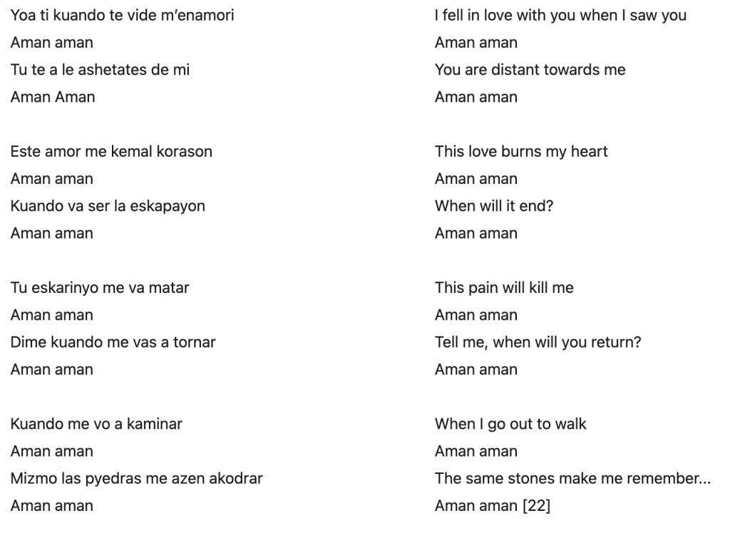 To the best of my knowledge, the first Ladino version of this song was not performed in America by Sephardim in the years leading up to the Great Depression. Although there are many Arab melodies with Ladino lyrics that have been in America for the last 90 years, I selected this melody in particular because an interview that I had with a Ladino musician inspired me to bring his lyrics to America. A Ladino version of this song was put out in Istanbul through the label Gözlem Gazetecilik Basın ve Yayın A.Ş. by the group Los Paşaros Sefaradis in 1995. Upon meeting Selim Hubeş, a member of the band that recorded this song, I asked him about the source of the lyrics. Hubeş told me that an Armenian in Istanbul taught him the Ladino lyrics!