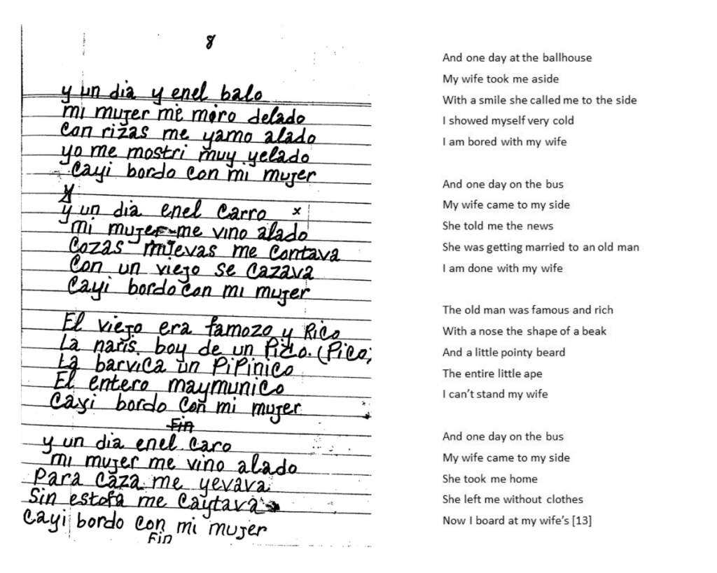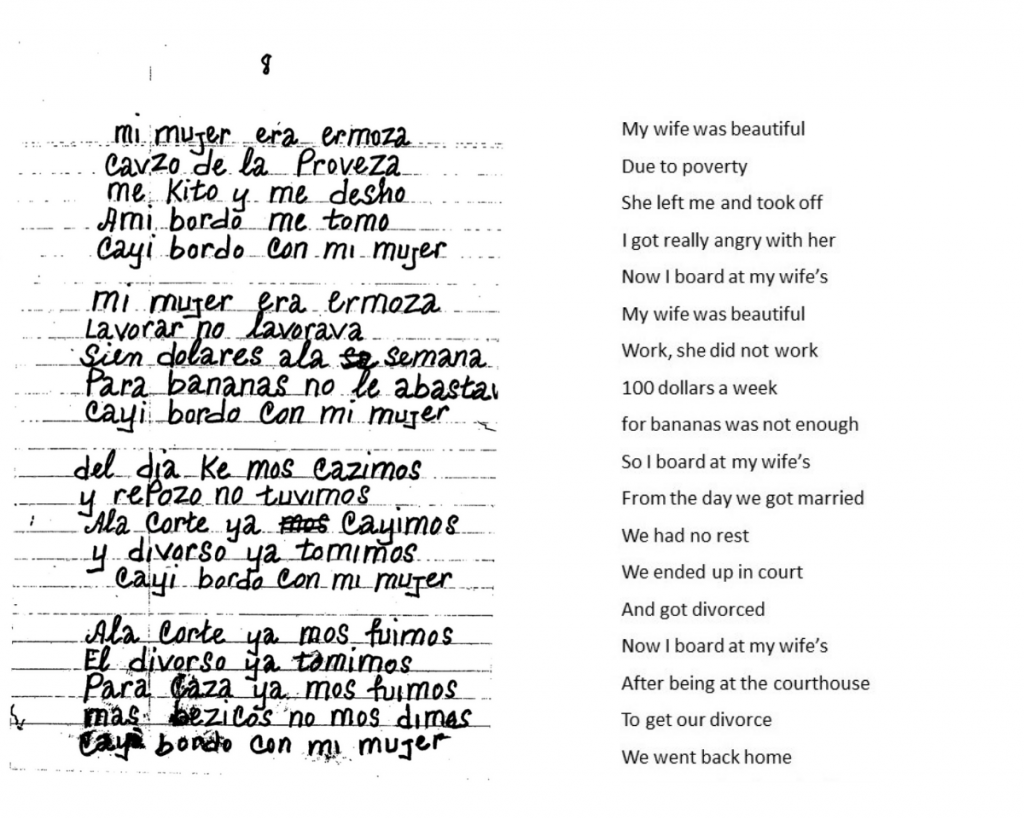 The phrase “cayer bordo” borrows from the English verb “to board,” but it is also a play on the Spanish pun “cayer gordo,” which means to find someone unappealing. The lyrics show that the singer is both paying rent to his wife and that he is fed up with her. By continuing to sing playful songs like these into the time of the Great Depression, Sephardim could enjoy themselves and temporarily escape the despair wrought by their low-paying jobs and increasing unemployment.